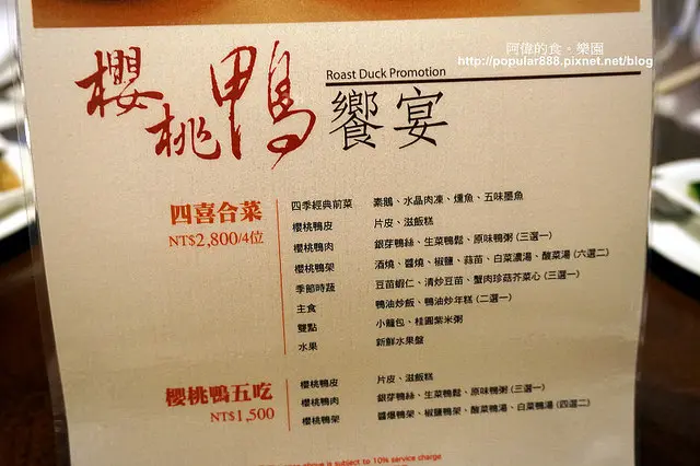 這次推出的"櫻桃鴨饗宴"分兩種形式,上面的<四喜合菜>4人2800元,就包括了<櫻桃鴨五吃>,再加上前菜、配菜與主食、雙點及水果。如果只點<櫻桃鴨五吃>,那要再另外點蔬菜、點心、水果,意思差不多。