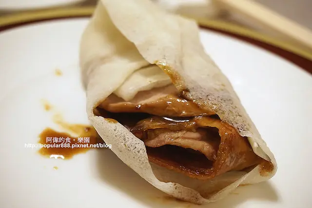 服務生會幫我們將片鴨加了甜麵醬與蔥段用荷葉餅皮包好送到面前。
