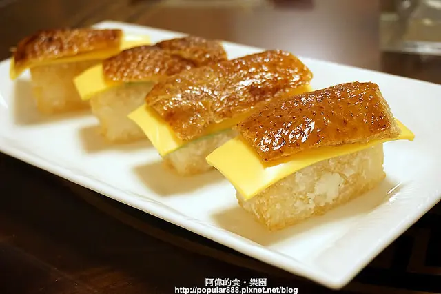 這是阿嘉師傅自創的菜色,將鴨皮放在烤過的方型飯團上,這飯團裡面也具滋味而非一般的白飯,與鴨皮之間夾著一片起司,起司底部還塗了層薄薄的綠芥末。由於飯團是熱熱的,會讓起司與芥末稍為融合,上方肥厚的鴨皮一咬流出的油脂再交融,是既甜又帶點鹹的多層次口感!