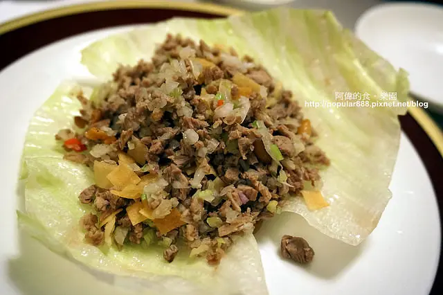 以"蝦鬆"的概念,將食材換成鴨碎肉,其中還有松子增添香氣。至於以往在蝦鬆裡放的老油條,改以炸餛飩皮取代,熱量油度降低。