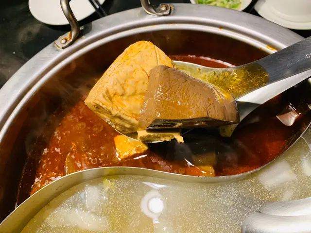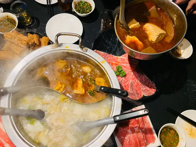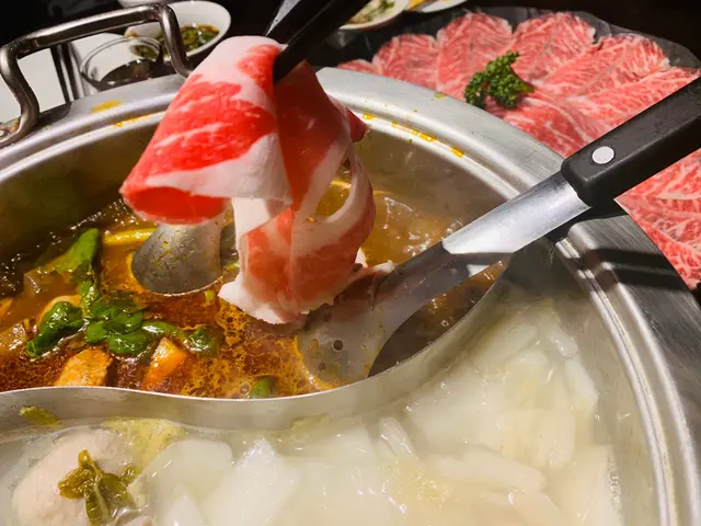 辣上癮 極品麻辣鴛鴦開鍋方式是鍋底每人120元,鴛鴦鍋每桌加100元(清湯、麻辣和酸菜白肉,皮蛋香菜),鴨血和豆腐無限供應,那個酸菜白肉湯溫和、酸而不嗆,非常正!以牛骨及炒過的食材熬煮而成的麻辣湯頭,同樣是可以喝的湯