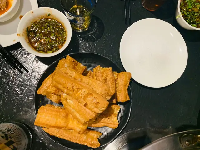 這老油條是經典的中國吃法,將油條浸鍋3秒拿起放入砂糖翻滾,入口會吃到油條的一面脆、一面軟同時吸附湯汁和糖粒,很有趣的吃法