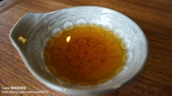 服務人員會先在杯內撒點鹽注入高湯,先品嘗原味雞湯鮮美,