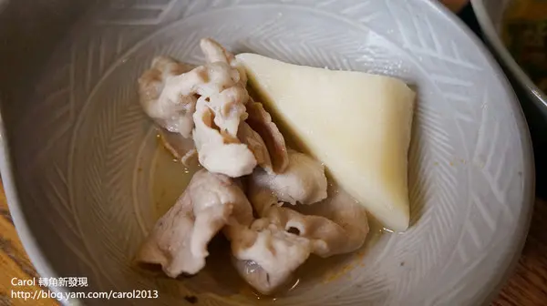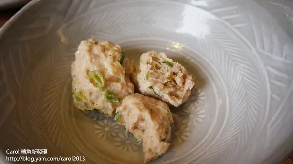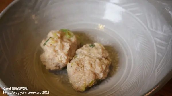 雞肉丸添加雞軟骨,雞肉丸出乎意外有嚼勁,其中宜蘭三星蔥花辛香突顯雞肉鮮甜口感。