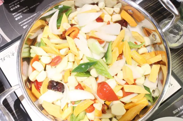 第二步:舖了大蒜、紅薯、洋蔥、胡蘿蔔、西芹、紅椒、青椒、番茄、紅棗和枸杞等10種蔬食,在撲的同時,服務生還提了北京當時訓練時,同步要求精準和3分鐘擺盤完畢,就為了讓消費者可以不用等太久立即品味!