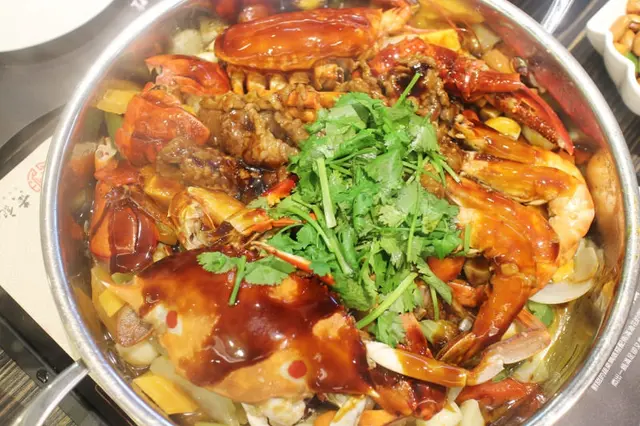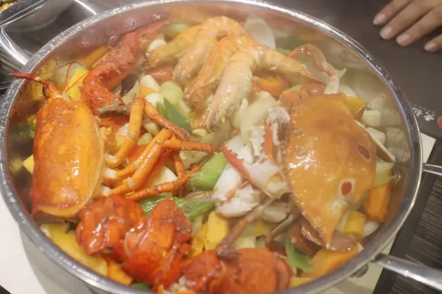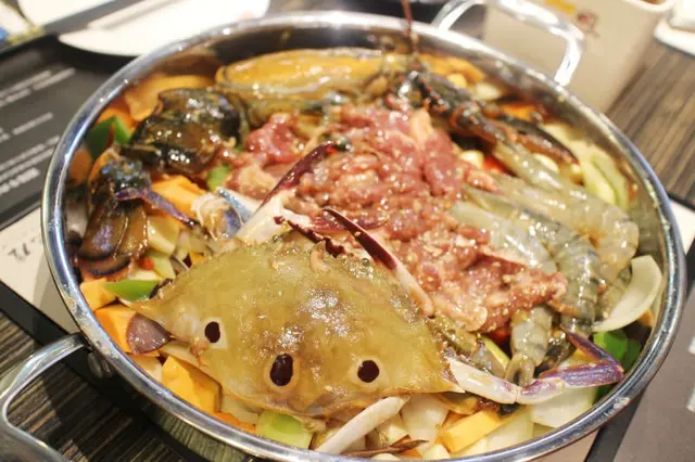 〈豪華拼盤〉燜鍋內的食材很豐富,內有梭子蟹、斑節蝦、半尾波士頓龍蝦,以及厚切安格斯牛小排肉片