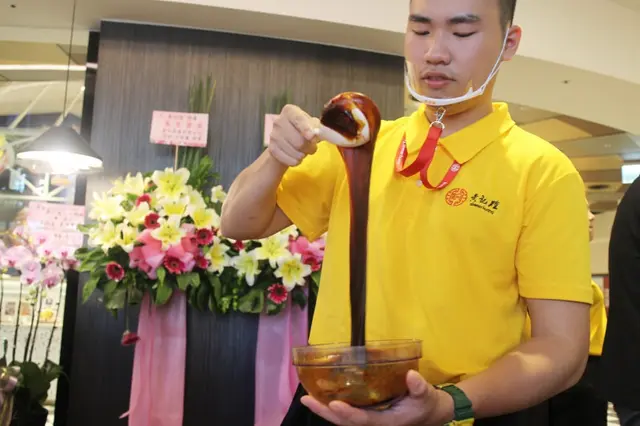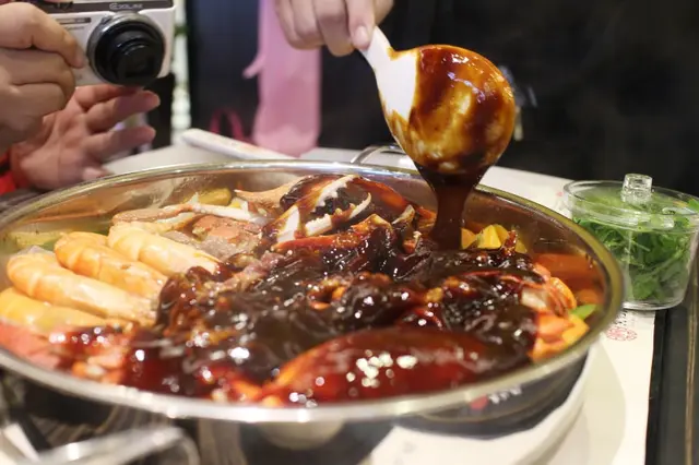 當燜煮到七八分熟度,身為燜鍋的靈魂就是圖中這勾芡非常黏稠的醬汁,在台灣可以吃到5種醬汁口味,分別是:原味經典汁、麻辣汁、海鮮汁、豉皇汁和特調汁,通常搭配海鮮的醬汁是原味經典汁,我有偷偷挖一口來嚐嚐,大概就像吃到老麵酵母的厚重,看著服務生用波浪式打法,為了確保每份食材是均勻塗抹醬汁,薄薄一層細心塗抹,剛剛還沒介紹,黃記煌三汁燜鍋的三汁是肉汁、菜汁和醬汁,當時主食或時蔬不夠新鮮,是完全沒有掩蓋物非常直接揭露出來,也算是對於主食或時蔬非常有信心的一個方式。