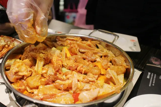 按照剛剛步驟再走一次,不一樣的地方是這次搭配醬汁帶微辣口感,海陸總匯內容有去骨雞腿肉、翅中、豬五花和多利魚,非常好吃!四個女生分食剛剛好喔!