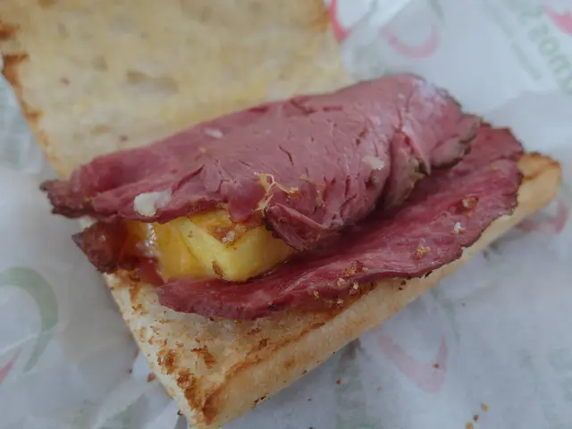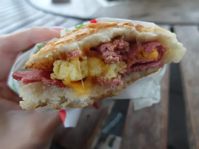 可以看到烤到微焦的麵包,整片的牛肉,烘蛋,還有融化的起司