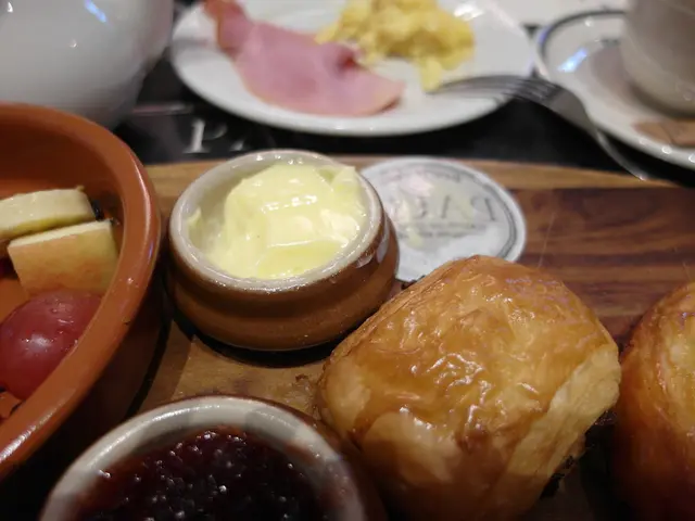 我個人比較不愛這種有嚼勁的雜糧麵包~所以沾了很多奶油配著吃