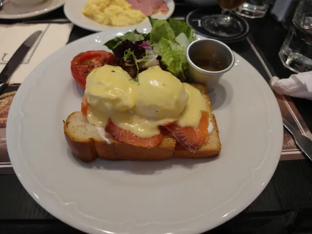 一刀切下去~讓整個蛋汁流出來~喔喔喔~再配上鮭魚、麵包、荷蘭醬和優格