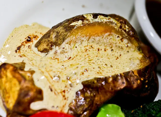 另一位朋友 ( 聽說學習知名部落客寫右方45度正妹之類會吸引人氣 ) 點的是一樣的牛排,但選了香烤蜜薯,什麼是蜜薯呢.....