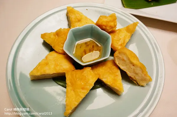 使用魚漿、花枝漿、 鮮蝦製成,外皮酥脆內Q彈,
