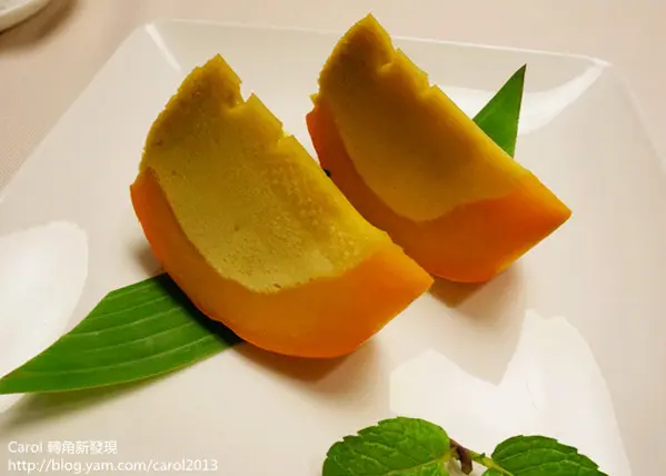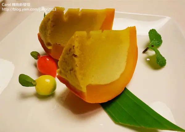 布丁旁的果子是可以食用的,內層很像是豆沙餡不會過於甜膩。