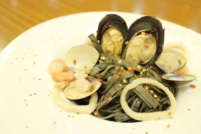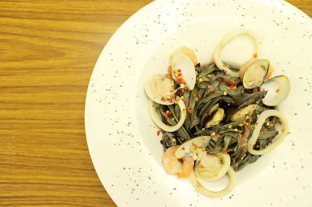 這麵條很有意思,你看看這外表和平常吃的墨魚麵完全不同喔!不是走那種吃完嘴唇和牙色一起黑嘛嘛路線~淡菜、蛤蠣、大蝦仁和透抽,口味不像墨魚麵如此重卻能滿足口裡鮮味,相當不錯