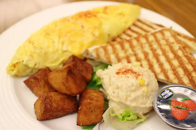解決完歐姆蛋早就飽了,沒想到還有烤得恰恰的吐司可以裹草莓醬、鮪魚沙拉和馬鈴薯塊,好險同行有個大胃王,不然通通剩一半那對店家太不好意思了