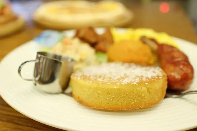 林了蜂蜜的厚鬆餅瞬間變得濕潤不膩口,中間一坨相當紮食的地瓜泥相當正點!