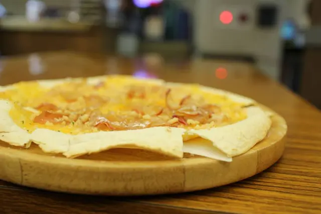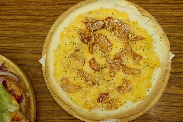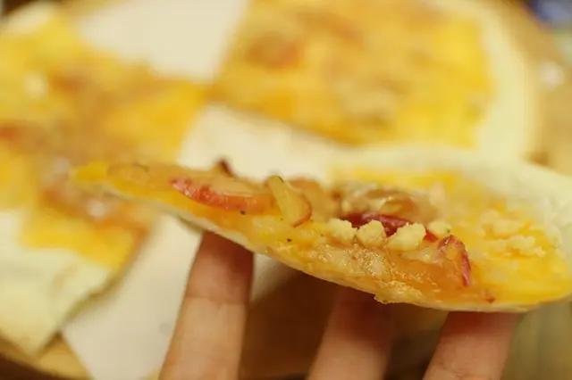 薄脆的披薩餅皮除了雙色起司,還有獨家釀製的蜜蘋果,滋味甜甜,好吃得不得了!再飽都要全部囫圇吞下肚