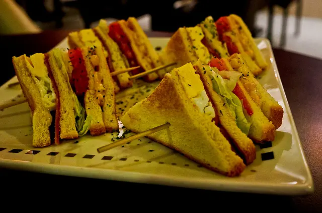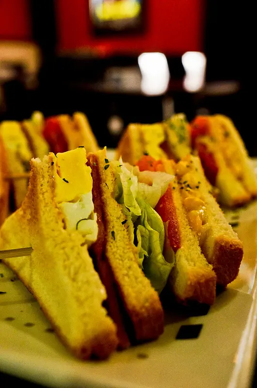 雞蛋配火腿,生菜搭配蕃茄,最外面一層是玉米配上美乃茲醬