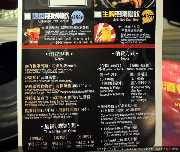 點餐時間1.5小時,用餐時間2小時,最後加點時間為平日22:30,假日23:00