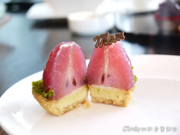 使用整顆的洋梨 放入調好的紅酒醬汁內去浸漬 洋梨一入口就有淡淡酒香