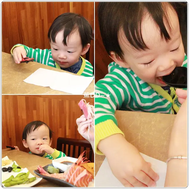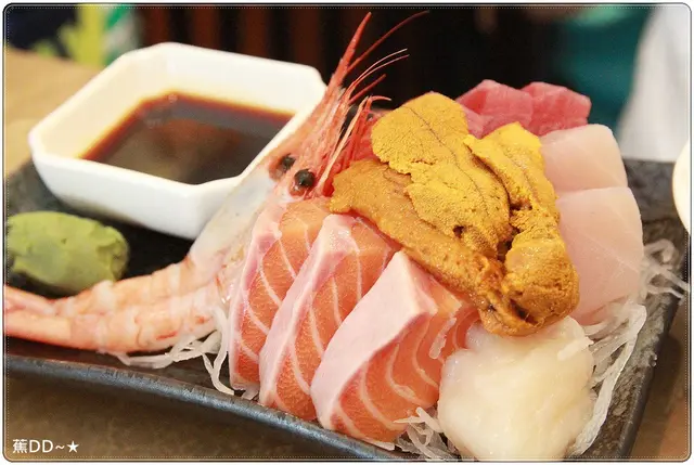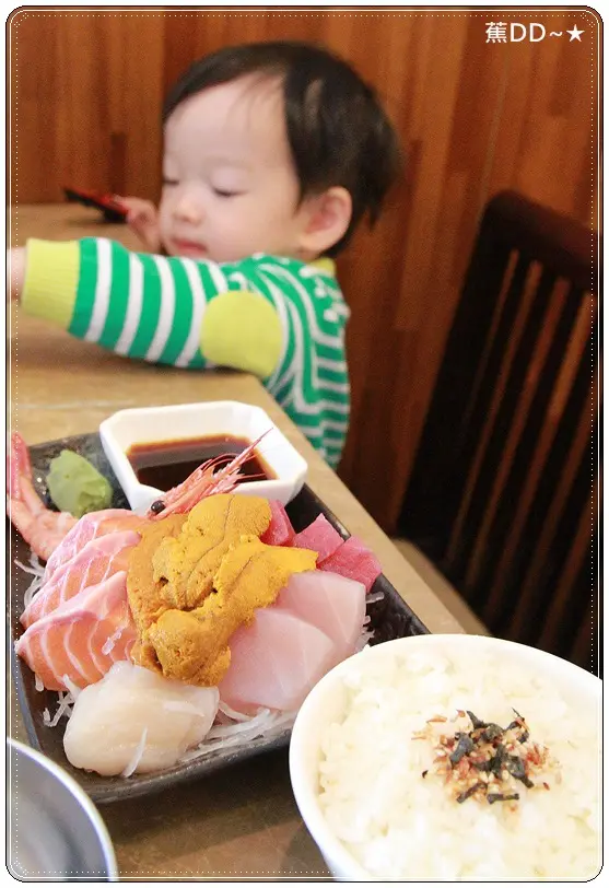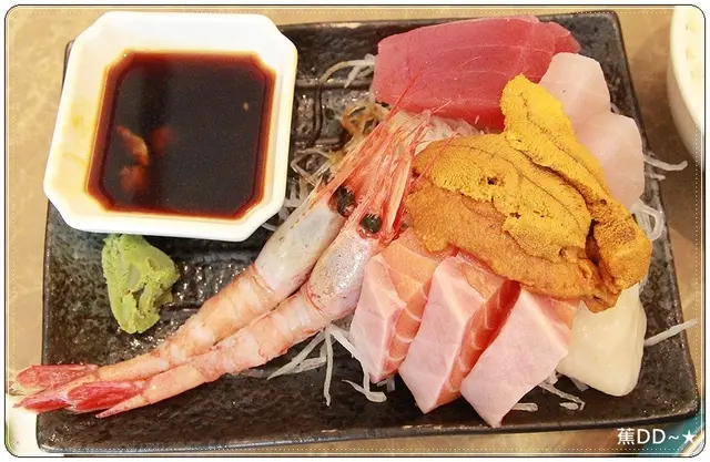 噗媽點的『海鮮定食』有鮭魚x3、鮪魚x3、旗魚x2、海膽、干貝及甜蝦x2,生魚片無論厚度及鮮度都還不錯,鮮甜的甜蝦及干貝表現也不俗,但海膽噗媽還是愛永和的『壽老大』,整份餐點雖然價格乍看下不平價,不過用餐後的感覺還算超值,不過噗媽生魚片只愛吃鮭魚(以後點餐還是要把生魚片全換成鮭魚XD)。