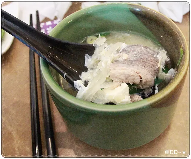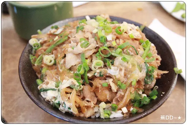 不常吃日本料理的噗嬤點了『豬肉蓋飯』,當餐點一上桌後,噗嬤嘴中唸唸有詞的說:「怎麼這麼多…」,真的!『豬肉蓋飯』份量真的頗大份,應該是男生適合的份量,所以噗嬤幾乎把1/3都給了阿噗,豬肉及洋蔥等比的份量加入蛋液拌炒,最後灑上大量的蔥段,實在是可以大口扒飯的一道料理,但吃到最後實在是有點膩,即使大家都分食了一些,還是吃不完。