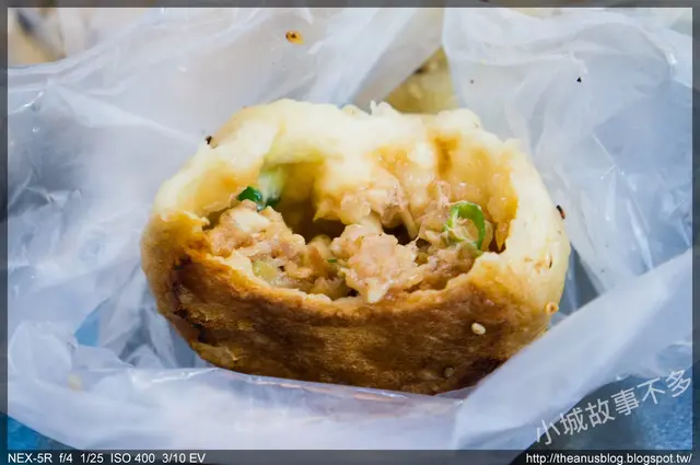 首先是豬肉的,肉末裡面有放胡椒,蔥花,因此吃起來屬於比較重口味一點,而上面的餅皮吃起來軟軟QQ的,跟下方形成強烈的對比