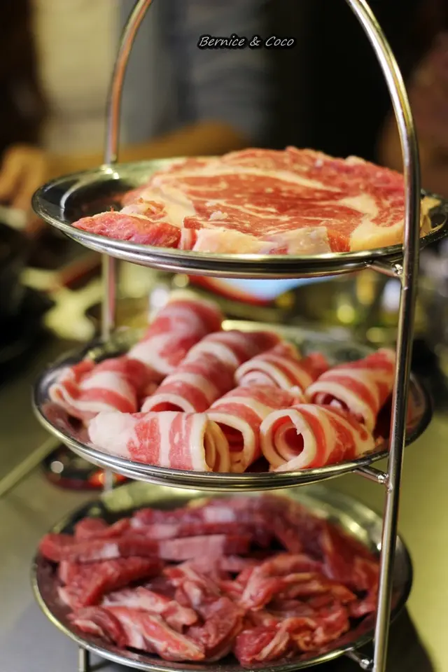 像在吃下午茶般的三層架擺放的是肉品