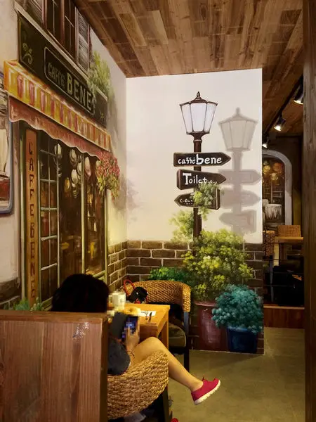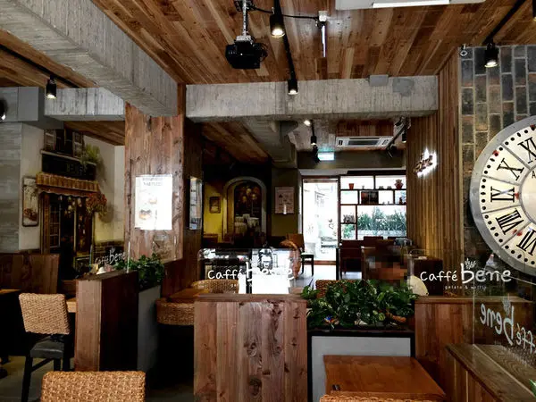 caffe' bene 的裝潢很用心,雖然工業風格的店家比比皆是,但他們的風格也很注意細節,不管是牆壁的每一處,甚至是天花板都有做完整的設計,不是隨隨貼貼壁紙而已,應該也砸了不少錢,是個拍照好店。