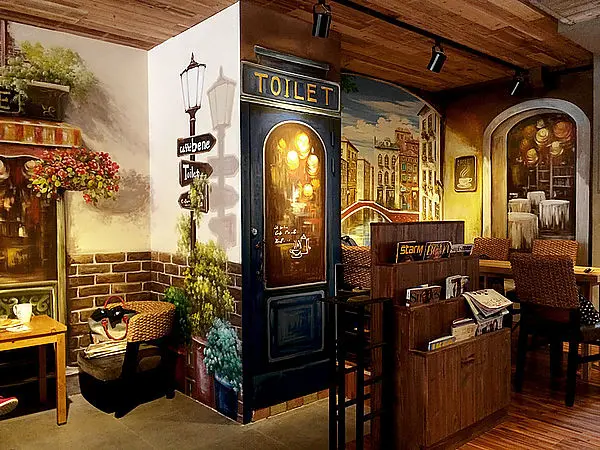 牆壁畫得非常漂亮的廁所,感覺像是在畫 威尼斯,裡面也是清一色木紋裝潢,而且絕對比你們想像的還要大間!!!!