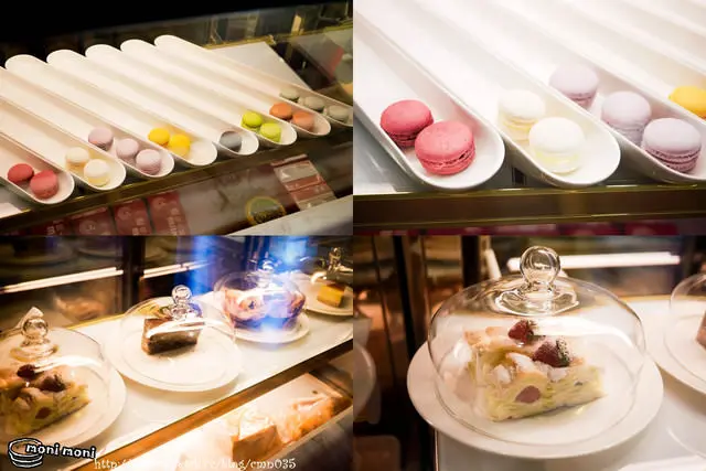 進門的左邊就是蛋糕櫃,擺滿了馬卡龍與各式甜品。