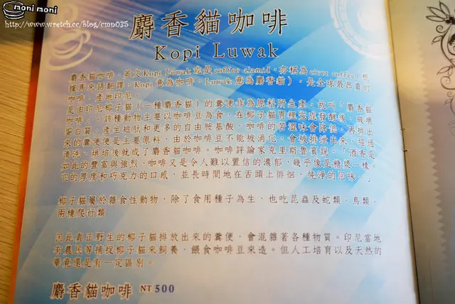 原來它是一種來自印尼的椰子貓(一種麝香貓),該種動物以咖啡為食,因為咖啡豆無法被消化,經由糞便排出來,再清洗烘培而成的麝香貓咖啡。