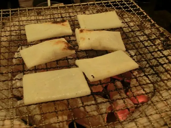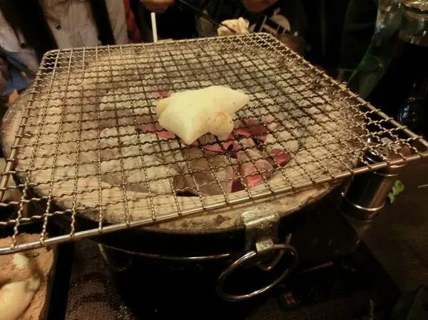 在壽喜燒店上烤爐,每次看到都覺得很妙,據說東豐店原本是做燒烤的,但被鄰居抗議後才轉為壽喜燒店,所以這烤爐是為了不忘本嗎XD,年糕上場啦,一樣看美眉動手,我們等著吃就好,小鬼最愛看這個