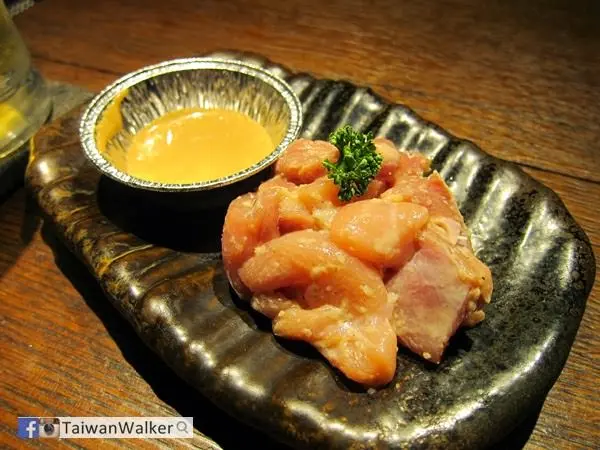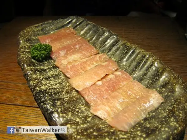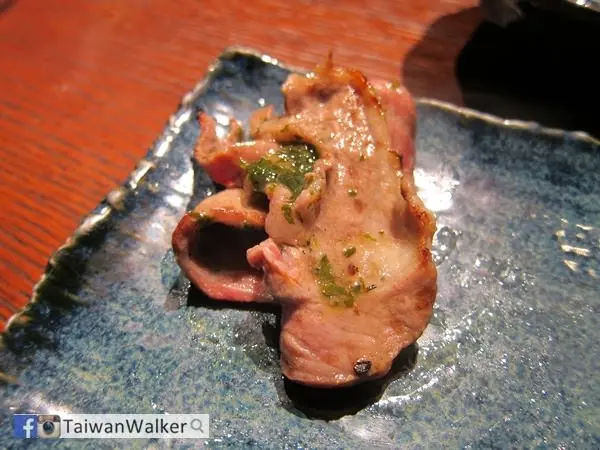 椒鹽霜降豬 (NT180),所謂的霜降豬、松板豬,其實是香港人講的豬頸肉。肉質是有別於豬肉的其他部份,較爽,但我覺得這個肉跟烤肉醬或梅醬會較好,因為肉味比較不夠