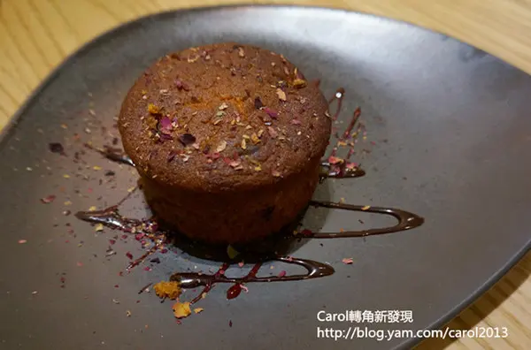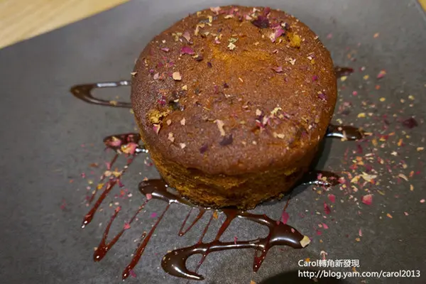 蛋糕濃郁黑糖、桂圓香氣,頂端玫瑰花瓣更增添花香。