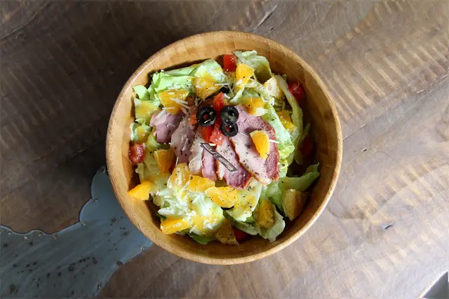 裡頭生蔬有每日新鮮嚴選的美生菜、黑橄欖、小番茄,再淋上在地新竹關西金桔醬,