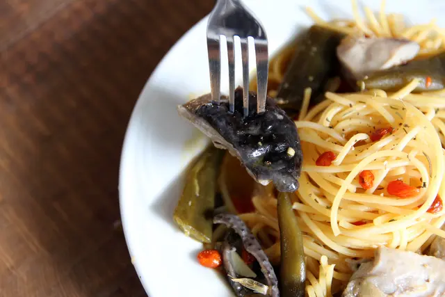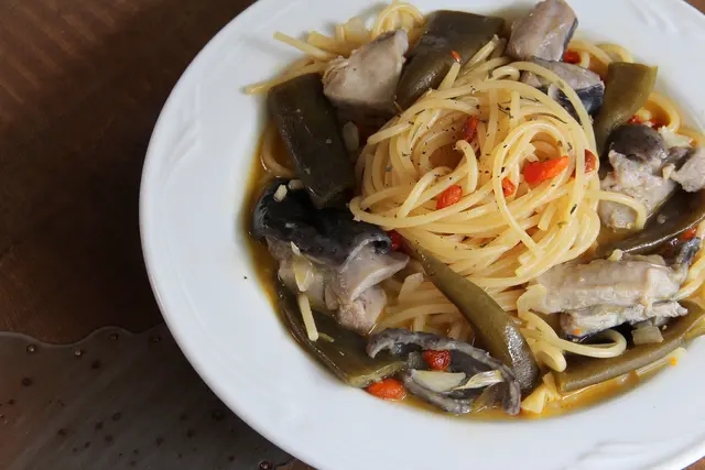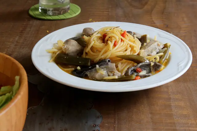 只以剝皮辣椒、米酒、枸杞簡單調味的烏骨雞義大利麵料理,完全沒有其他添加,