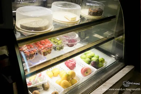 蛋糕櫃擺滿了新鮮蔬果,用料十分乾淨,蛋糕也都是手工製作的。