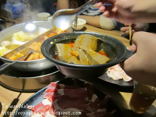 火鍋料滾了~! 先喝一下湯, 清湯味道很夠呢! 豬骨的味道喝起來蠻清爽的, 很不錯喔
