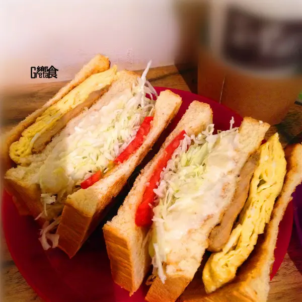 總匯有三片吐司,一層夾著蛋和豬肉,另一層夾著馬鈴薯泥、高麗菜絲和蕃茄