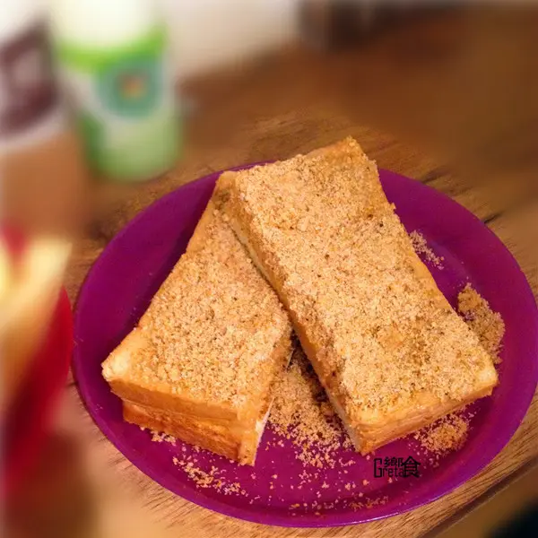 三明治中間夾著花生醬,上層淋上煉乳後在鋪上土豆粉