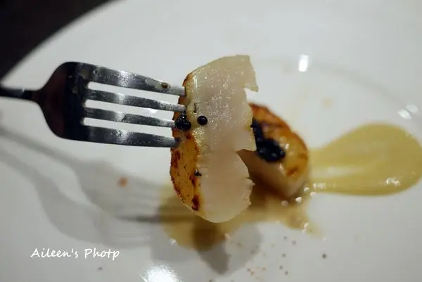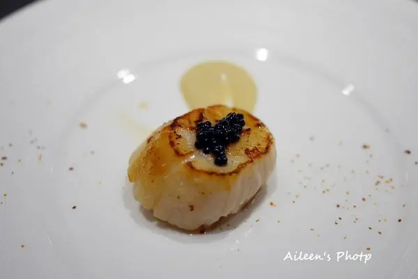外表煎到微帶金黃色的干貝,其實裡面還十分的鮮嫩,搭上來自法國的魚子醬,