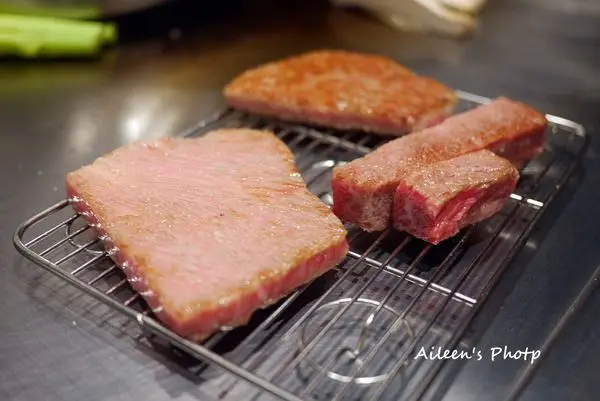 開始料理的時候主廚會先把牛肉先放到鐵板上煎到兩面微焦,再放到鐵架上靜置。