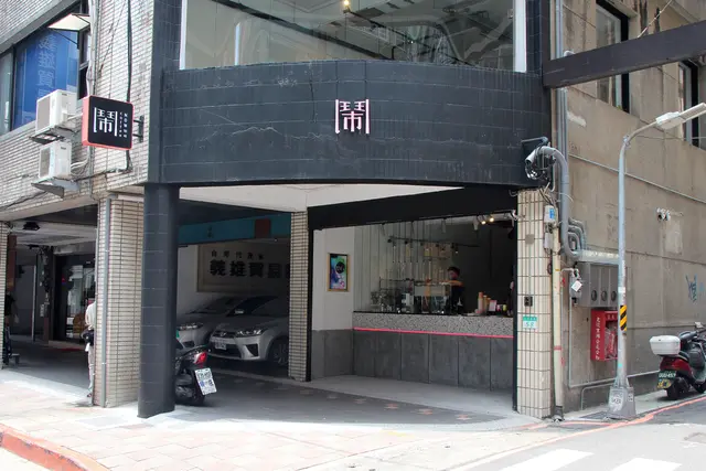 鬧咖啡 NOW coffee 設計黑色電捲門拉開,是提供外帶的吧檯,內用的話,需由建築店鋪側牆旁的門口進入。