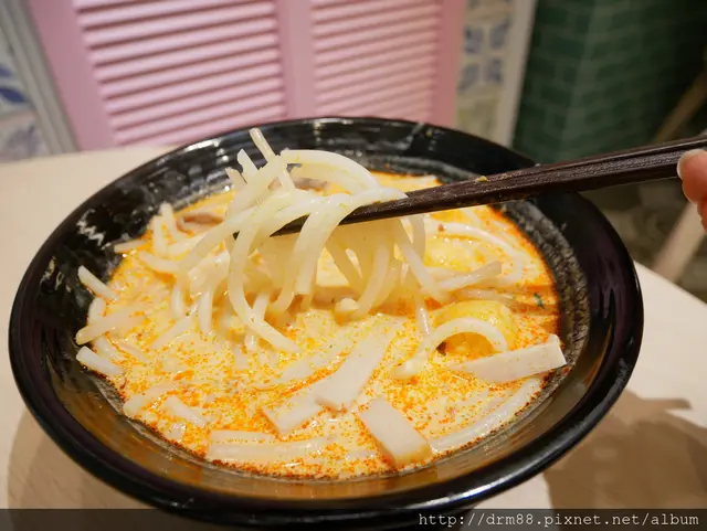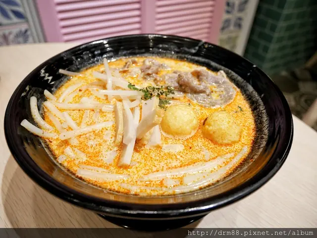 老闆跟我說,叻沙有分四種,主要是有沒有加咖哩,有沒有加椰奶,這裡的叻沙是咖哩口味+椰奶的,