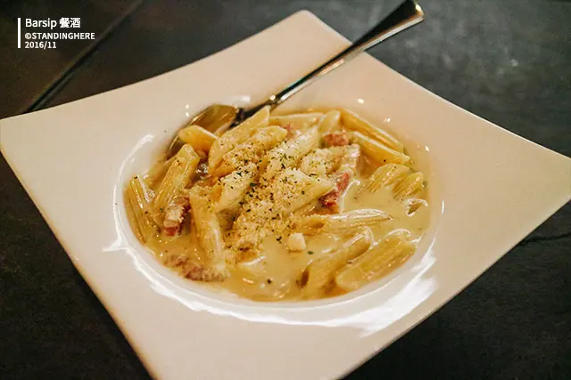 帕瑪森起司 / 鮮蛋黃 / 黑胡椒 / 洋蔥 / 厚切培根 / 筆管麵