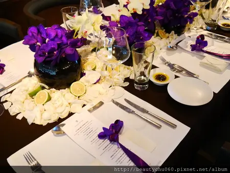 這一桌有特別的佈置紫色及白色的蝴蝶蘭底下襯著滿滿的白玫瑰花瓣