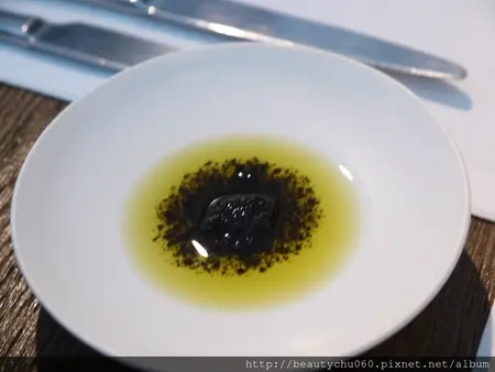 沾麵包的橄欖油中間墨綠色的是橄欖泥