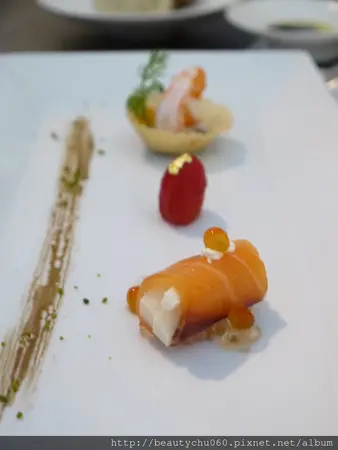 藍蝦佐蒔蘿鯛魚醬塔、梅子桂花漬聖女蕃茄(還有一片金箔耶)、